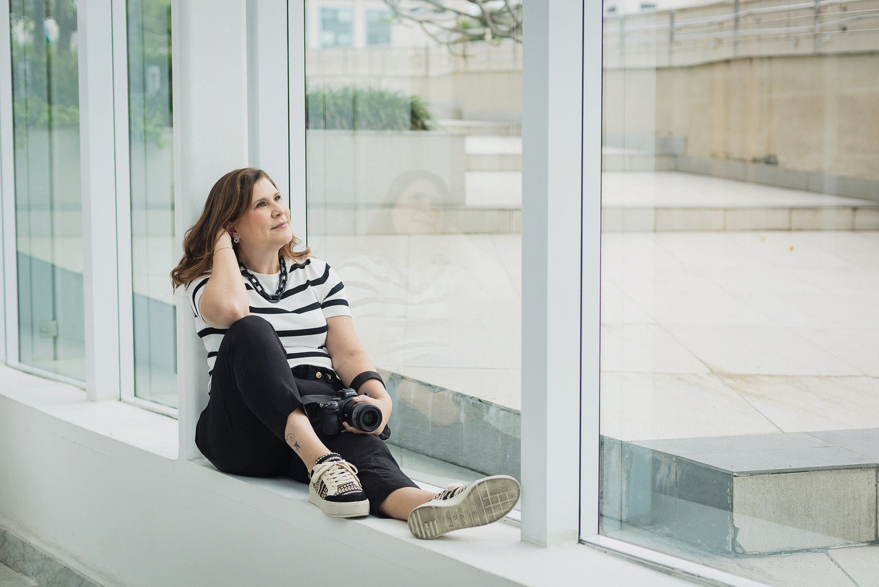 Fiz meu primeiro curso de fotografia quando ainda nem tinha essa câmera, mas aquelas compactas, “saboneteiras”. Nessa época eu dava aulas em cursos de inglês e foi esse trabalho que me permitiu fazer cursos e comprar minha primeira câmera DSLr, a Nikon D40x. Estudava e praticava, meu filho tinha uns 4 ou 5 anos na época e era meu modelo cobaia. Levava a câmera pra todo canto! Perguntava a amigas quem queria ser modelo pra eu praticar. E assim fui fazendo pra ganhar prática e experiência, até me sentir capaz e confiante para passar a cobrar pelo primeiro trabalho. (Quem se identifica?)